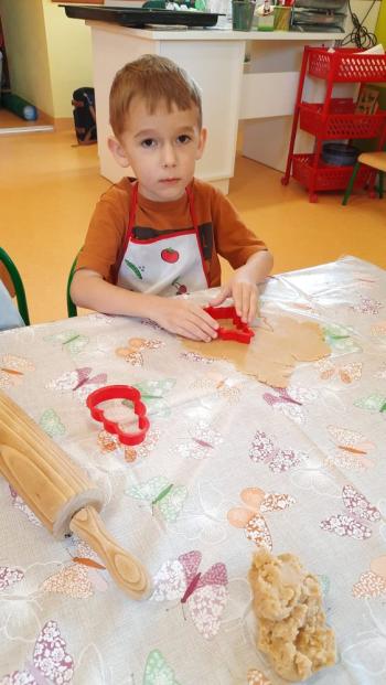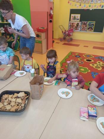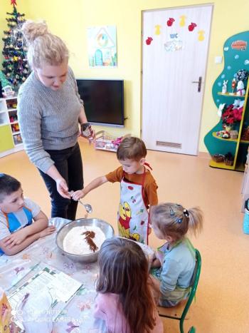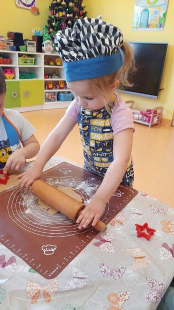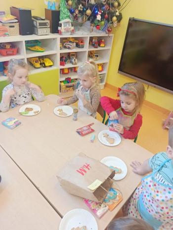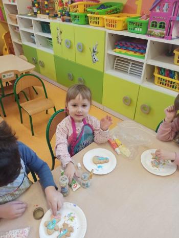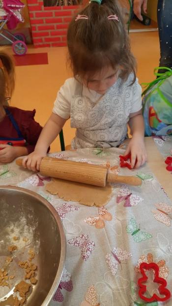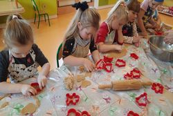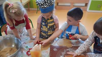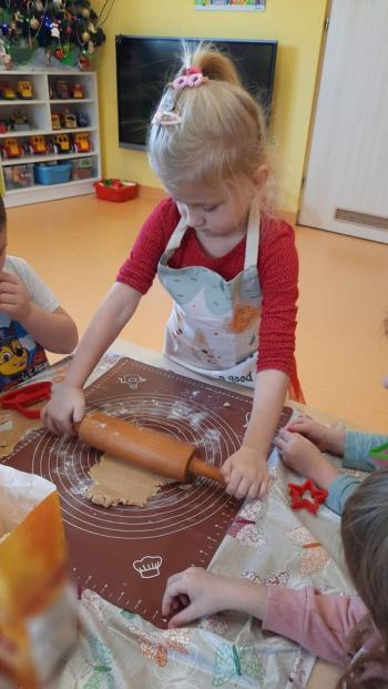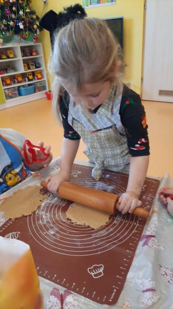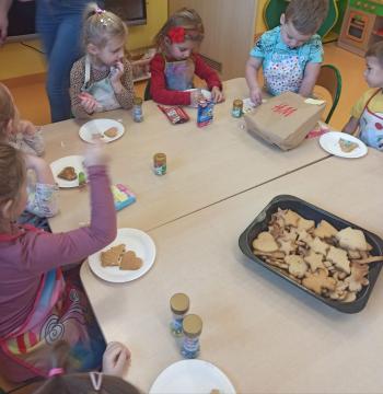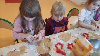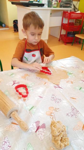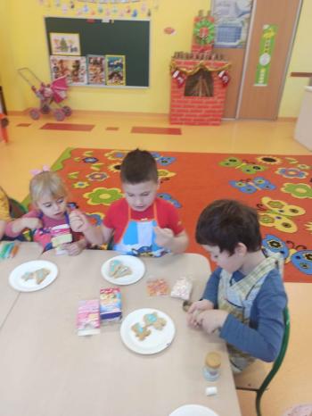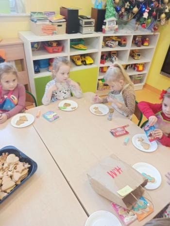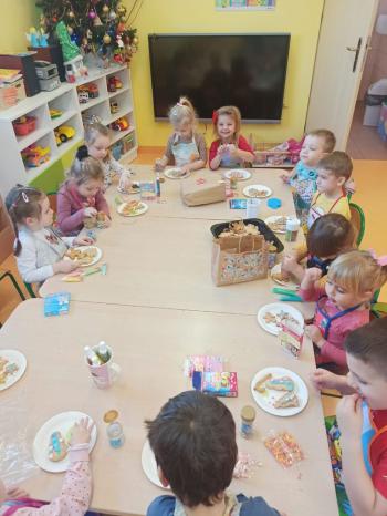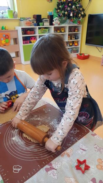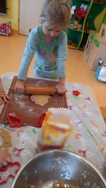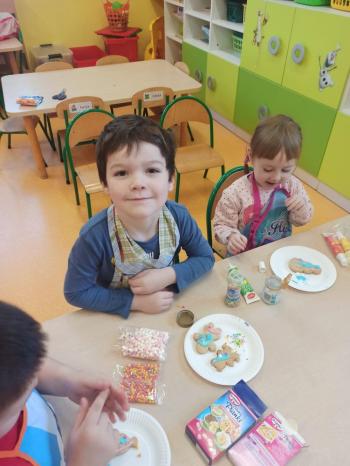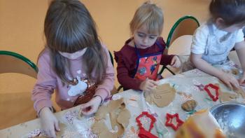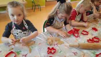 Przedświąteczny tydzień w grupie Motylków upłynął nam miło na przygotowaniach do Świąt Bożego Narodzenia. Oprócz wykonania dekoracji na świąteczne drzewko, maluszki postanowiły również zadbać o smakołyki na świąteczny stół. W poniedziałek salę Motylków przepełniały piękne zapachy pierniczków. Maluszki wspólnie przygotowały potrzebne ciasto, by później móc nadać ciasteczkom różnorakie kształty. Dużo zabawy i radości było także podczas ich dekorowania, a najwięcej satysfakcji dała możliwość ich skosztowania i świadomość, że sami je wykonali. Smak pierniczków zaspokoił wszystkie małe podniebienia