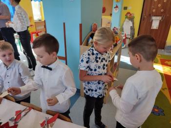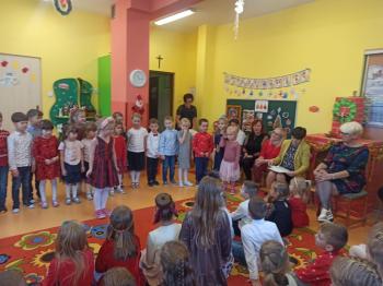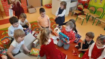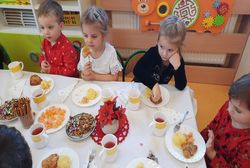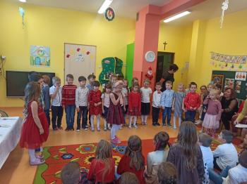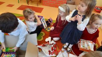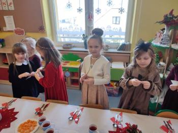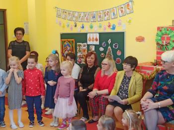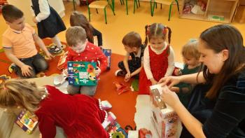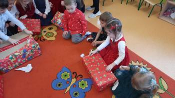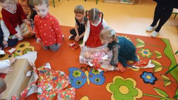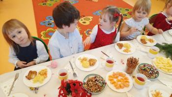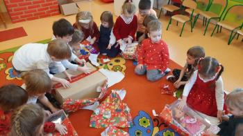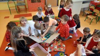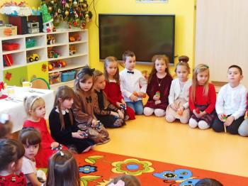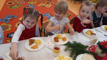 22 grudnia w naszym przedszkolu zgodnie z tradycją zorganizowaliśmy przedszkolną Wigilię. Od rana panowała świąteczna atmosfera, wszyscy odświętnie ubrani, sale pięknie przystrojone, na stołach białe obrusy, to wszystko sprawiło, że uświadomiliśmy sobie, że święta są już bardzo blisko. Zebraliśmy się w sali Motylków, gdzie grupa Pszczółek i Biedronek, zaprezentowała krótki program artystyczny, świąteczne życzenia i pastorałki. Po występie wszystkie dzieci, pracownicy przedszkola i zaproszeni goście, zaśpiewali kilka znanych kolęd, po których pani dyrektor Leokadia Kukla złożyła zebranym świąteczne życzenia. W grupach składaliśmy sobie życzenia łamiąc się opłatkiem i zasiedliśmy do uroczystej Wigilii. Po zjedzeniu tradycyjnych potraw, przyszedł czas na prezenty, które jak zawsze sprawiły naszym milusińskim dużo radości.