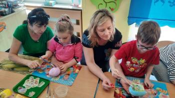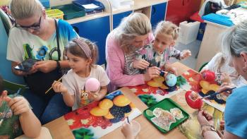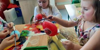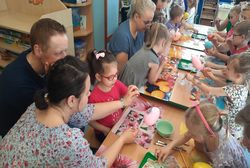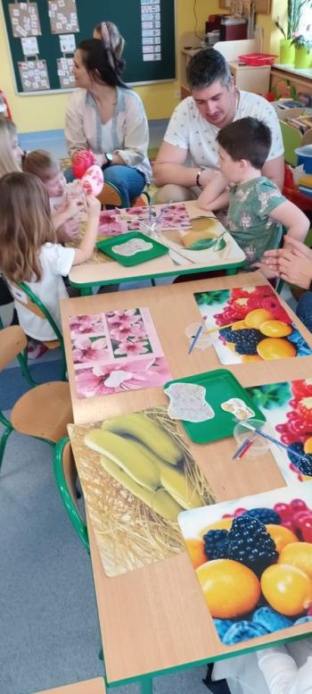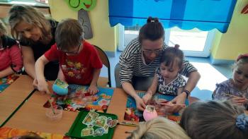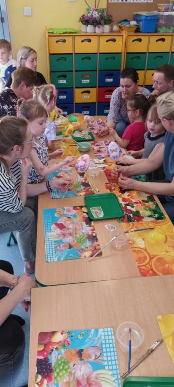 W środę 27 marca grupa Biedronek zaprosiła swoich rodziców na zajęcia otwarte, podczas których panowała przedświąteczna atmosfera. W trakcie pierwszej części zajęć rodzice bacznie obserwowali jak ich pociechy uczestniczą w zabawach matematycznych i doskonalą przeliczanie w zakresie 10 oraz rozwijają spostrzegawczość. Następnie, wspólnie przystąpiliśmy do wykonania świątecznej pracy technicznej w postaci wielkanocnego jajka ozdabianego techniką decoupage’u. Współpraca rodziców z dziećmi przyniosła wspaniałe efekty i każdy mógł się pochwalić pięknym kolorowym świątecznym jajkiem, a na koniec spotkania zaprosiliśmy rodziców do wspólnej zabawy. Dziękujemy za obecność i mile spędzony razem czas.