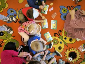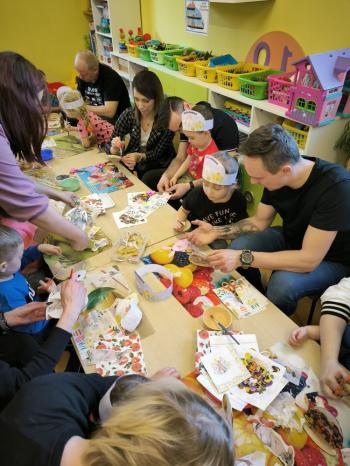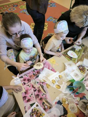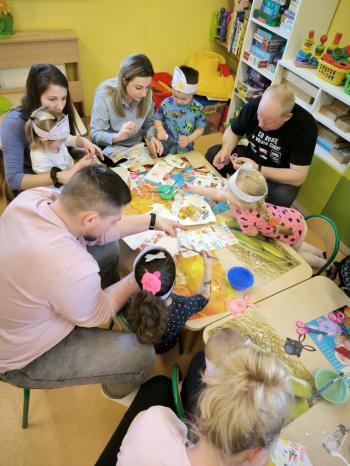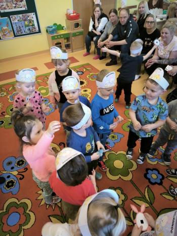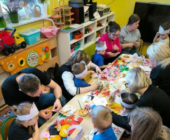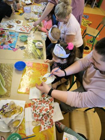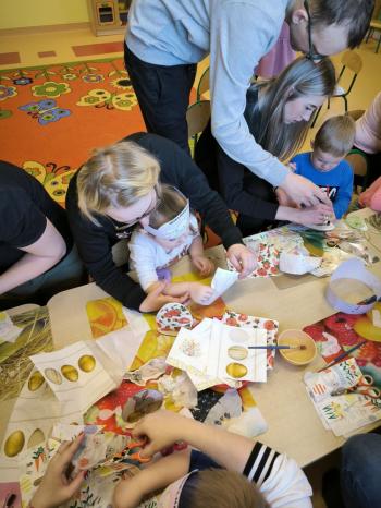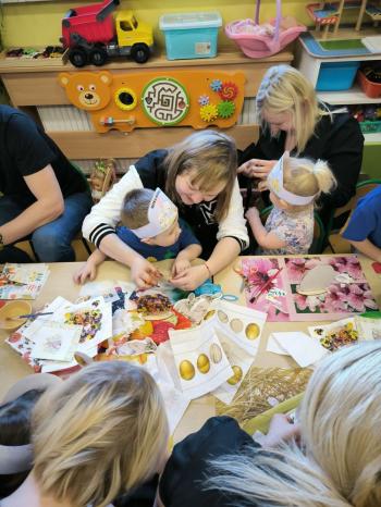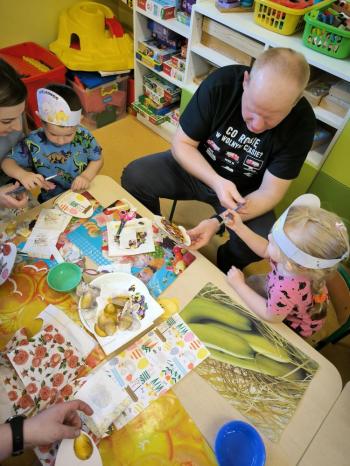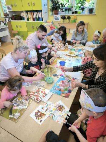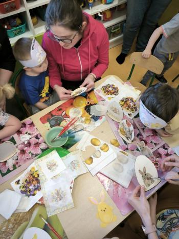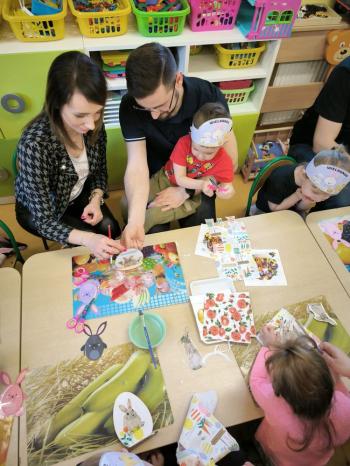 W dniu 26 marca w grupie Motylków odbyły się zajęcia otwarte, na które byli zaproszeni rodzice naszych przedszkolaków. Temat zajęć nawiązywał do zbliżających się Świąt Wielkanocnych. Na początku zajęć dzieci powitały swoich rodziców w rytmicznej piosence ,,Dzień dobry witam cię", kolejnym punktem zajęć była rozmowa z dziećmi na temat produktów wkładanych do wielkanocnego koszyczka. Podczas zajęć na dzieci czekało również, kilka prostych zadań do rozwiązania: musiały ułożyć jajka w wielkanocnym koszyczku, według podanego wzoru, a także dopasować zajączkowi brzuszek w takim samym kolorze jak reszta jego ciała. Wszystkie dzieci świetnie sobie poradziły. Nie zabrakło również zabaw ruchowych i do jednej z nich zaprosiliśmy również rodziców, aby pobawili się razem ze swoim dzieckiem. ☺ Na zakończenie na wszystkich czekało zadanie plastyczne, podczas którego wykonali śliczne jajko wielkanocne, techniką decoupage.