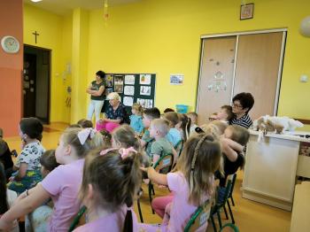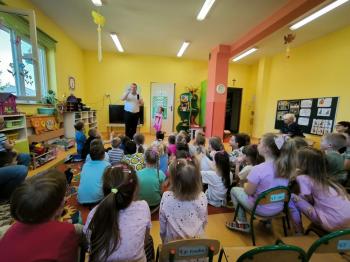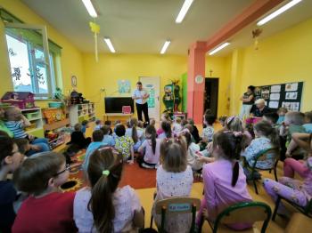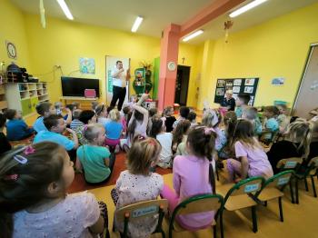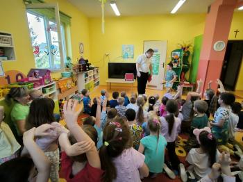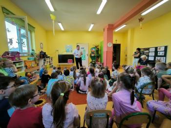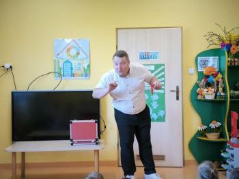 Dnia 09.04.2024r. nasze przedszkole odwiedził niezwykły gość. Ze swoim magicznym programem wystąpił prawdziwy iluzjonista. Magik zabrał nas do świata czarów i magii. Dzieci miały możliwość przeżycia czegoś niezwykłego, tym bardziej, że aktywnie uczestniczyły w przedstawieniu. Uczyły się tajemniczych zaklęć, a odważni ochotnicy pomagali mistrzowi w jego pokazie i same czarowały. Wszystkim dzieciom bardzo podobały się niesamowite sztuczki i czary. Wyprawa do tajemniczego świata dostarczyła wszystkim sporo satysfakcji, wiele humoru i radości. Niektóre z dzieci choć na chwilę same mogły zamienić się w magika.