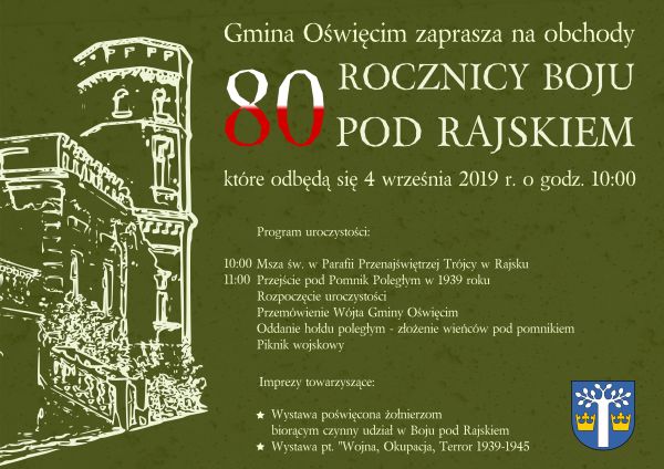 Zapraszamy do wzięcia udziału w upamiętnieniu żołnierzy, którzy brali czynny udział w bitwie pod Rajskiem z 3 na 4 września 1939 roku. Obchody rozpoczniemy Mszą św. w Parafii Przenajświętszej Trójcy następnie przejdziemy korowodem pod pomnik i jak co roku oddamy hołd poległym.