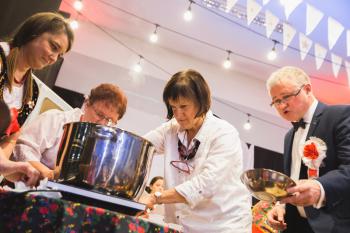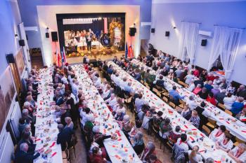 Wraz z melodią "Jak długo na Wawelu" w dłoniach biesiadników pojawiły się chorągiewki i powiewały już przez cały wieczór, mimo że repertuar stawał się coraz mniej wojskowy i oficjalny. Zawody prawej i lewej części sali rozpoczęło krojenie chleba do zupy, która coraz rzadziej gości na naszych stołach, czyli wodzianki. Po konkurencji dla pań w szranki stanęli panowie. Ich zadaniem było wyprasowanie damskich reform z falbankami.