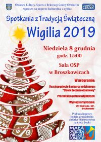 Zapraszamy mieszkańców na coroczne "Spotkania z Tradycją Świąteczną - Wigilia 2019" które w tym roku są nieco wcześniej niż zwykle tj. 8 grudnia w Remizie OSP w Broszkowicach o godz. 15:00.
