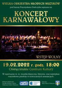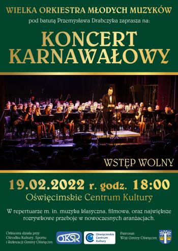 Serdecznie zapraszamy na Koncert Karnawałowy w wykonaniu Wielkiej Orkiestry Młodych Muzyków pod batutą Przemysława Drabczyka. Wydarzenie rozpocznie się w najbliższą sobotę 19 lutego o godz. 18:00 w sali OCK.