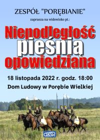 Zespół Porębianie zaprasza na widowisko muzyczne pt. "Niepodległość Pieśnią Opowiedziana" które odbędzie się najbliższy piątek 18.11.2022 o godzinie 18:00 w sali domu ludowego w Porębie Wielkiej ul. Wadowicka 79.WSTĘP WOLNY! Serdecznie zapraszamy.