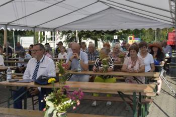 Pierwsza część Święta Plonów rozpoczęła się od uroczystej mszy świętej polowej koncelebrowanej, której przewodniczył ks. Arkadiusz Bąk. Część oficjalną otworzył sołtys Harmeż Adam Zieliński, który powitał wszystkich przybyłych na uroczystość.
