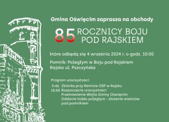 Zapraszamy uczestników na godz. 9:45 pod Remizę OSP przy ul. Św. Floriana 3 w Rajsku, skąd wyruszymy orszakiem pod pomnik "Poległym w 1939 r."