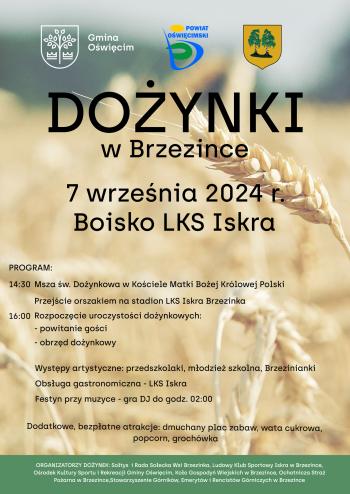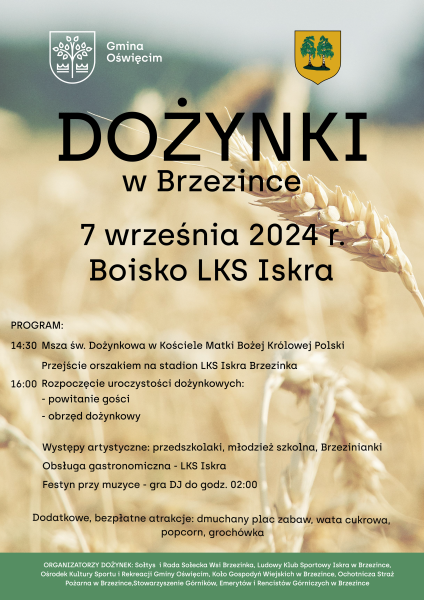 Dożynki w Brzezince kończą czas Święta Plonów w gminie Oświęcim. Zapraszamy do wspólnego świętowania w najbliższą sobotę o 14:30! Wydarzenie wsparł finansowo m.in. Powiat Oświęcimski.