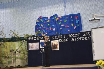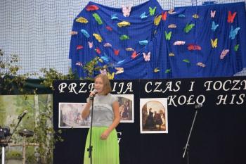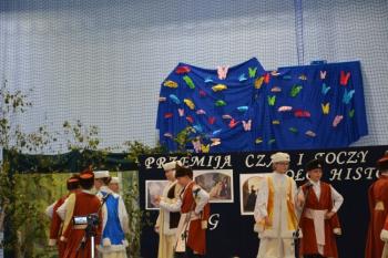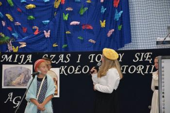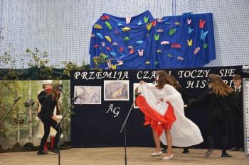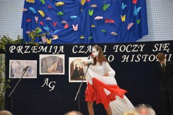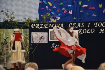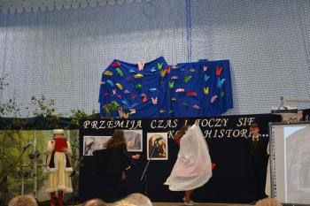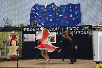 Po kilku przemówieniach rozpoczęła się część artystyczna. „Przemija czas i toczy się koło historii…” – fragment piosenki śpiewanej przez szkolny chór – stał się motywem przewodnim przedstawienia. Wszyscy obecni na sali przenieśli się do Pałacu Bobrowskich, gdzie Wanda Moné (Eliza Święcicka) oraz Artur Grottger (Oliwier Chałupka) wraz z innymi przybyłymi na bal zatańczyli pięknego walca. XIX-wieczni bohaterowie opowiedzieli o staraniach Polski o odzyskanie Niepodległości, a „Taniec białego orła” i piosenka „Niepodległa, niepokorna” zilustrowały w symboliczny sposób walkę Polaków. Obecni na sali mogli także zobaczyć wyświetlone obrazy Artura Grottgera z jego słynnego cyklu „Wojna”. Trzech powstańców przybyłych na scenę przypomniało o heroicznej postawie naszych przodków-bohaterów. Została przypomniana historia II wojny światowej – scenka z udziałem pani profesor i trzech uczennic pokazała trudne czasy szkolne po 1939 roku.