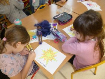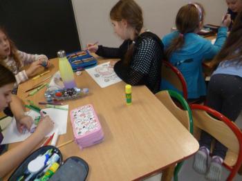Realizacja kolejnego zadania z programu edukacyjnego "Europa i Ja"- słownik polsko-francuski. Uczniowie uczyli się słów w języku francuskim związanych ze świętami z pomocą tablicy multimedialnej - ćwiczyli wymowę francuskich słówek np. choinka, bombka, anioł, św. Mikołaj, święta rodzina, gwiazdka, prezenty, wykonali słowniczek, kolorowali świąteczne malowanki i podpisali je francuskimi słówkami. Ponadto uczniowie rozwijali kompetencje językowe.
