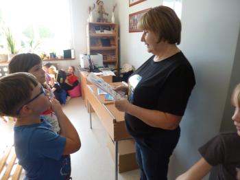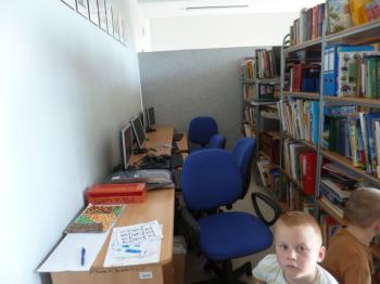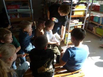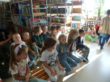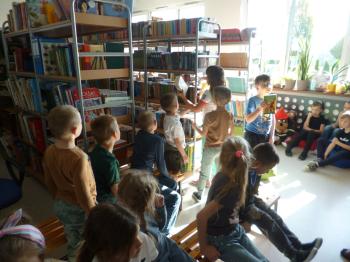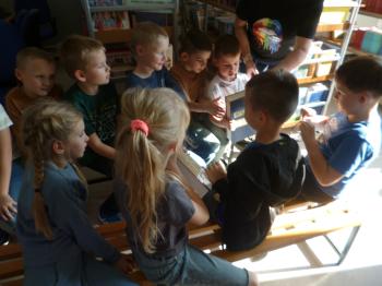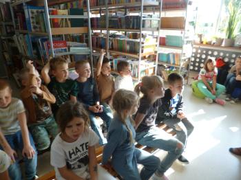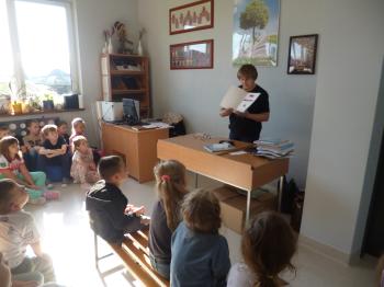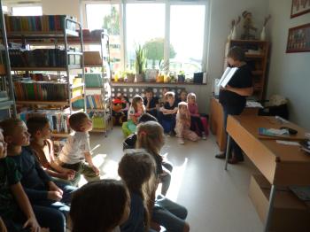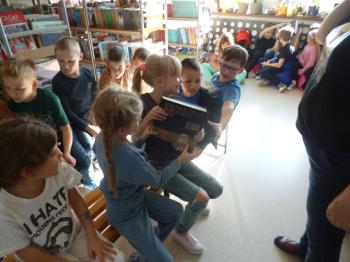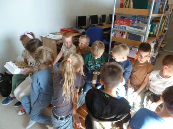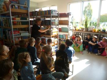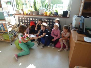 Z tej okazji dzieci ze świetlicy odwiedziły swoją bibliotekę szkolną. Pani bibliotekarka serdecznie przywitała dzieci, które z wielkim zaciekawieniem słuchały informacji o bibliotece, a także na czym polega praca bibliotekarza. Dzieci dowiedziały się również jakie zasady zachowania się obowiązują w bibliotece i jak należy dbać o książki. Zadawały pani bibliotekarce pytania jakie rodzaje książek znajdują się w bibliotece i które są najczęściej wypożyczane. Dzieciaki miały okazję wziąć do rąk wielkie słowniki, encyklopedie stwierdzając z uśmiechem, że „wiedza jest ciężka”. Pani bibliotekarka bardzo gorąco zachęcała dzieci aby wypożyczały książki, uczestniczyły w konkursach literackich czy plastycznych organizowanych przez bibliotekę i często ją odwiedzały. Na zakończenie spotkania dzieci podziękowały pani bibliotekarce za garść informacji o bibliotece i wręczyły jej wcześniej przygotowane laurki z zapewnieniem, że będą często przychodziły do biblioteki.
