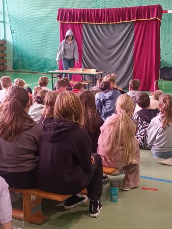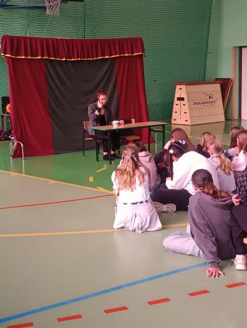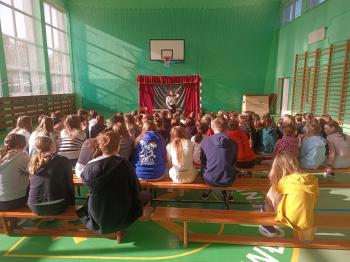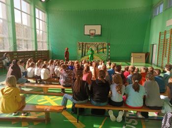 23 października w naszej szkole gościliśmy teatr profilaktyczny Maska z Krakowa. Aktorzy zaprezentowali dwa spektakle. Pierwszy z nich dla uczniów klas starczych „Szkolna elita” poruszał temat przemocy rówieśniczej. Przedstawienie propaguje prawidłowe reakcje na bycie świadkiem przemocy, uwrażliwia na krzywdę tych, którzy sami nie potrafią się jej przeciwstawić. Spektakl dla uczniów klas I –III Miś marzy skrycie o przyjacielu celebrycie poruszał niezwykle istotną tematykę uzależnienia najmłodszych dzieci od Internetu, zabawy i czasu spędzanego na korzystaniu ze smartfona, czy komputera. Co najważniejsze, uświadamia, jak wielką wartością jest bliskość przyjaciół w realnym świecie.