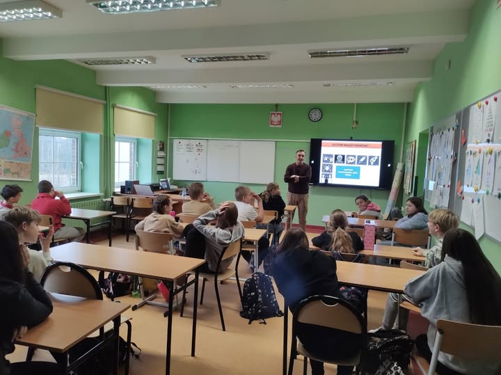 13 grudnia klasy VI-VIII uczestniczyły w prelekcji prowadzonej przez p. Piotra Rychłego - pedagoga resocjalizacji, specjalisty ds. uzależnień. Tematem prelekcji były cyberzagrożenia. Prowadzący uwrażliwił uczniów na niebezpieczeństwa wynikające z nadmiernego i niewłaściwego korzystania przez młodzież z popularnych portali społecznościowych oraz niedostosowanych do wieku gier. Podkreślił także potrzebę dbania o higienę cyfrową, czyli odpowiednią ilość snu, rozwijanie pasji poza siecią, uprawianie sportu, pielęgnowanie relacji w realnym życiu.