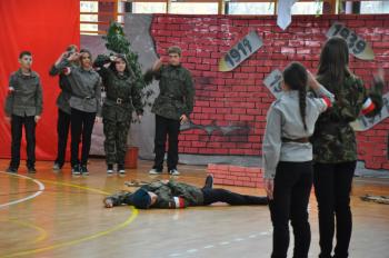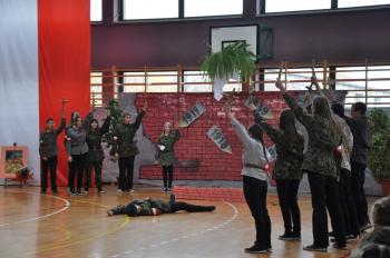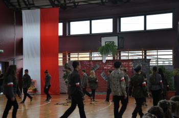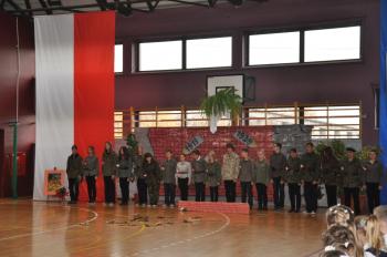 Kontynuacją tej myśli był program artystyczny uczniów gimnazjum przygotowany przez panią Zofię Kanclerz oraz prezentacja pieśni patriotycznych w wykonaniu szkolnego chóru pod kierunkiem pana Jarosława Cieciaka. Dodatkowym elementem był pokaz nowoczesnego tańca w stylu hip hop, do którego nasze gimnazjalistki przygotował pan Dawid Szewczuk.