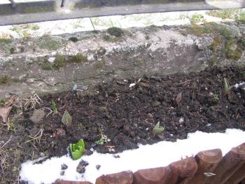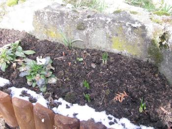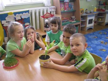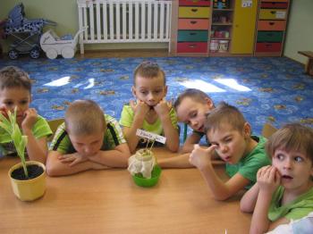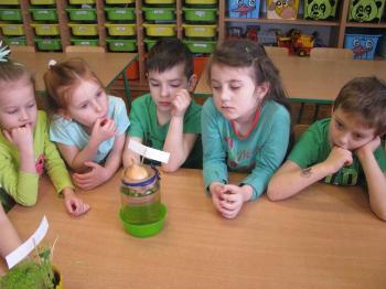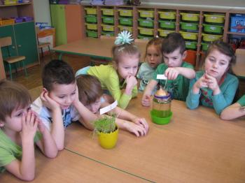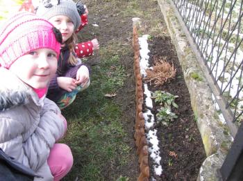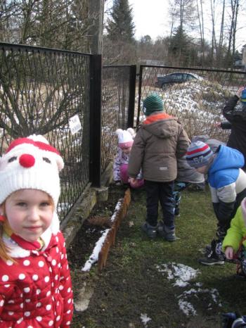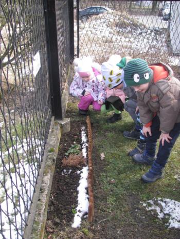 Marzec to czas budzącej się do życia przyrody. Mali przyrodnicy odwiedzili swój ogródek, który założyli jeszcze jesienią. Zauważyli listki krokusów i żonkili wychodzące spod ziemi oraz małego hiacynta. Stwierdzili, że wiosna już przyszła zarówno w ogródku jak i w kąciku przyrody w sali. Dzieci obiecały obserwować swoją hodowlę.